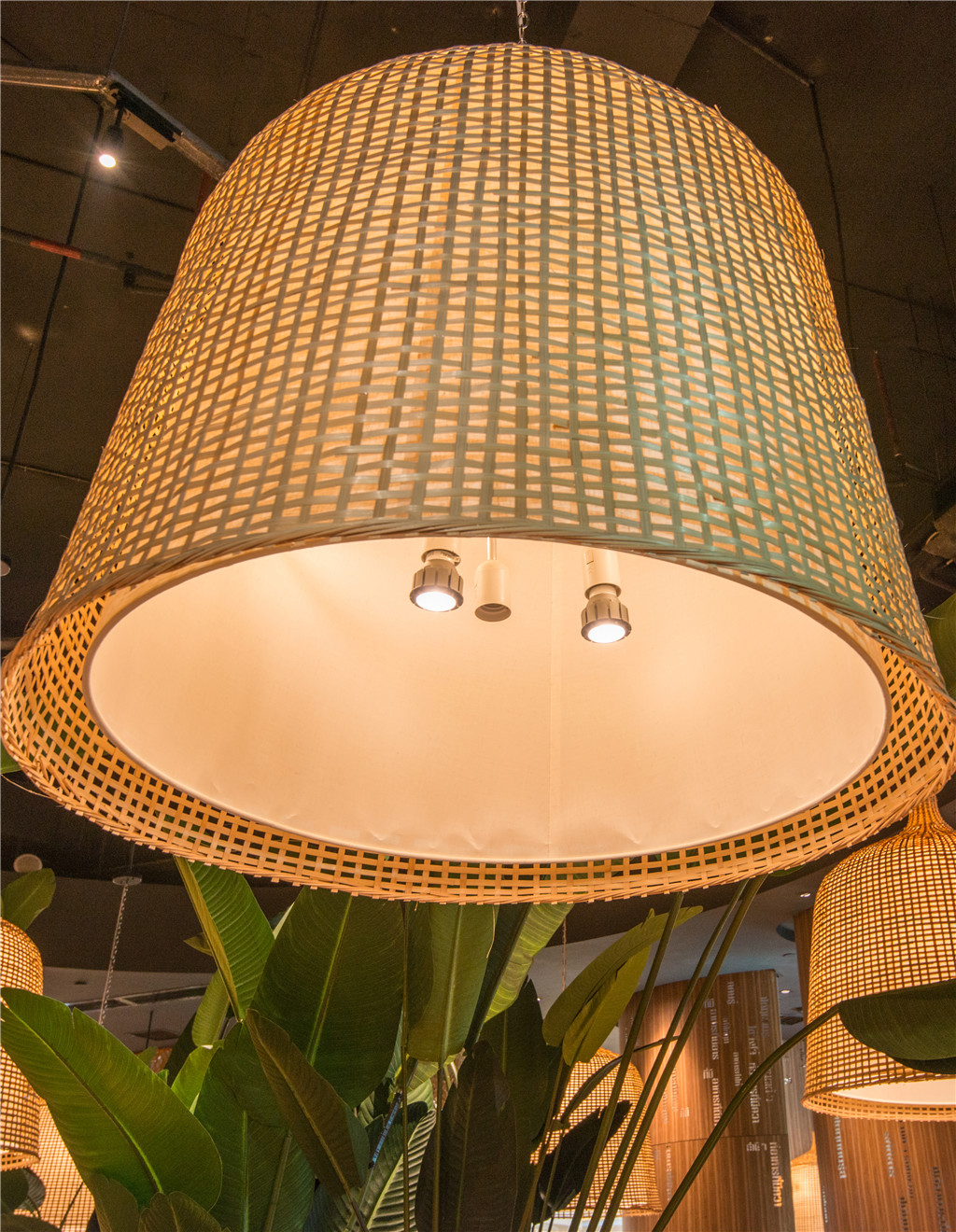 燈光將竹藝編織的燈罩,映射成柔和的金光罩,