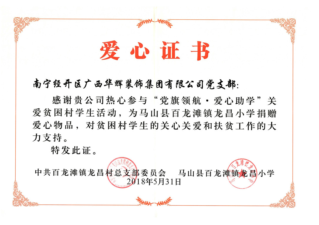▲龍昌小學(xué)贈予華輝集團(tuán)的愛心證書
