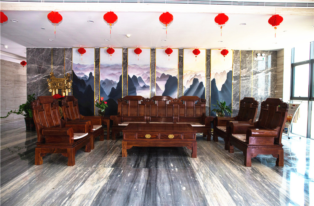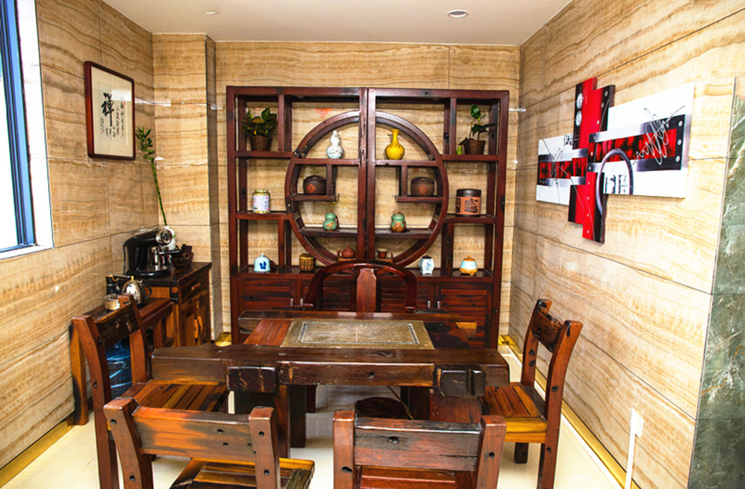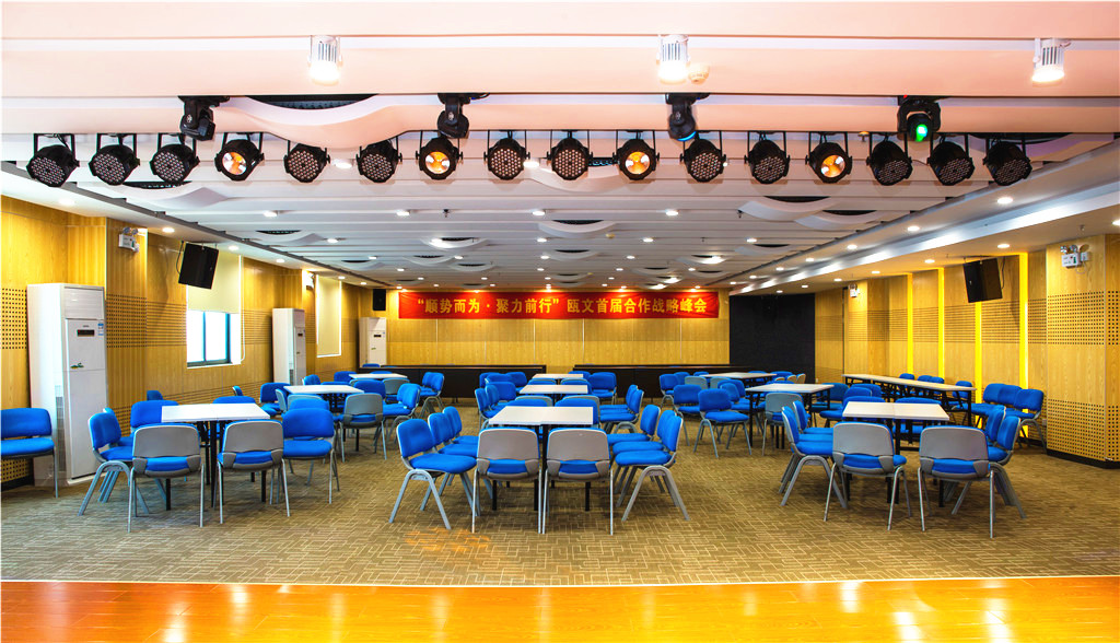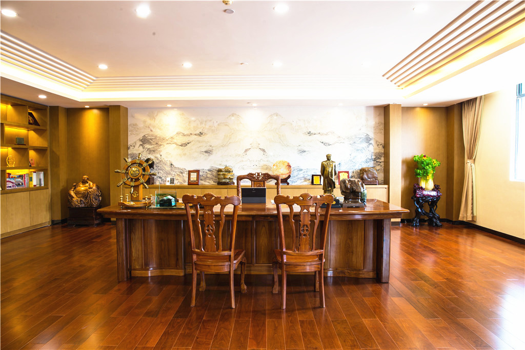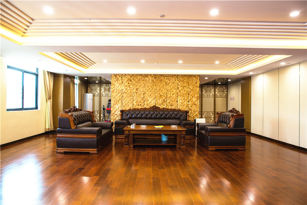 取水之藍、家之皇為元素,以木飾面、陶瓷、大理石為載體,應用于墻面、地面、主背景墻。體現了甌文集團厚德載物,開放包容,儒雅熱情迎八方來客的氣魄。