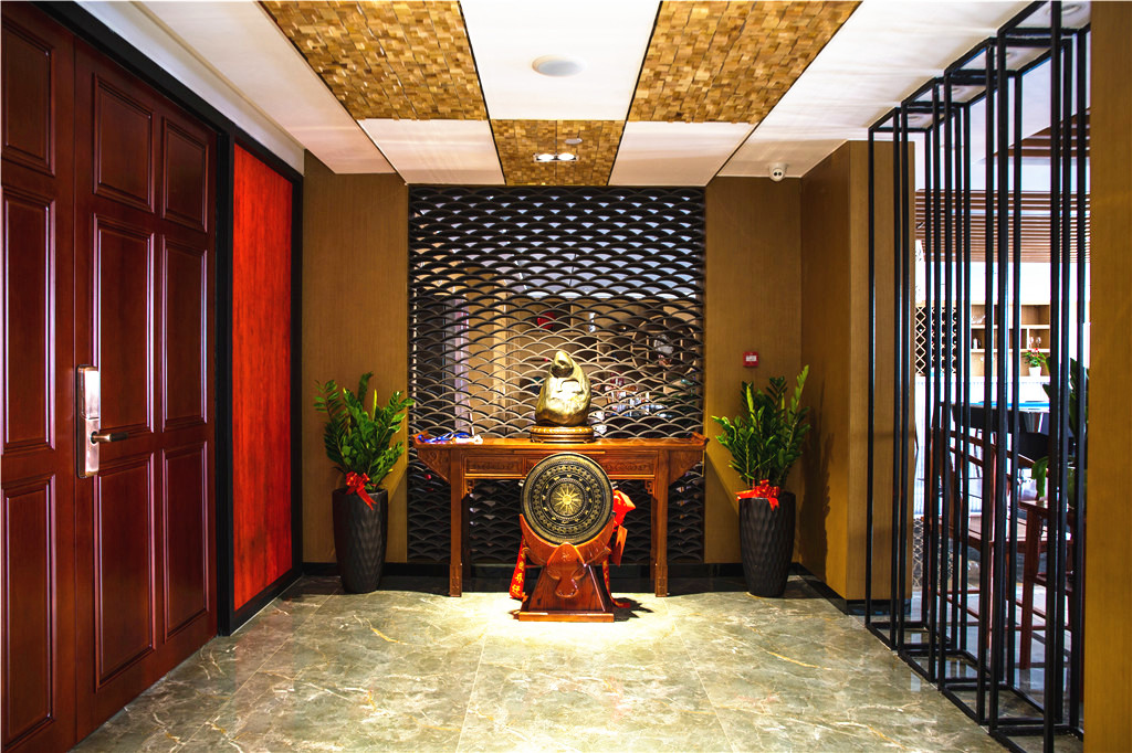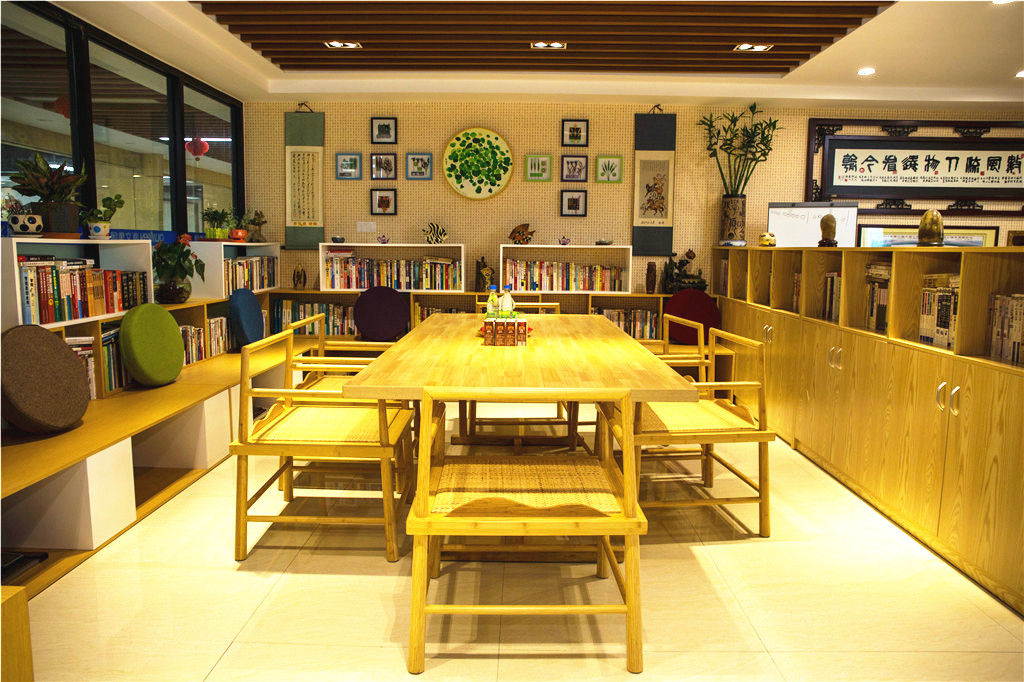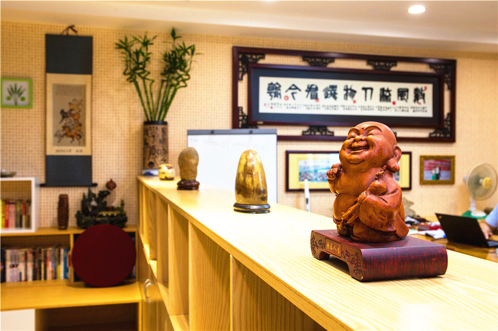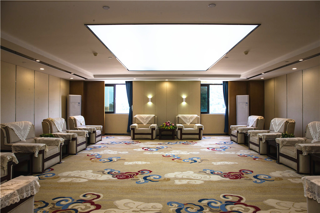取水之藍、家之皇為元素,以木飾面、陶瓷、大理石為載體,應用于墻面、地面、主背景墻。體現了甌文集團厚德載物,開放包容,儒雅熱情迎八方來客的氣魄。