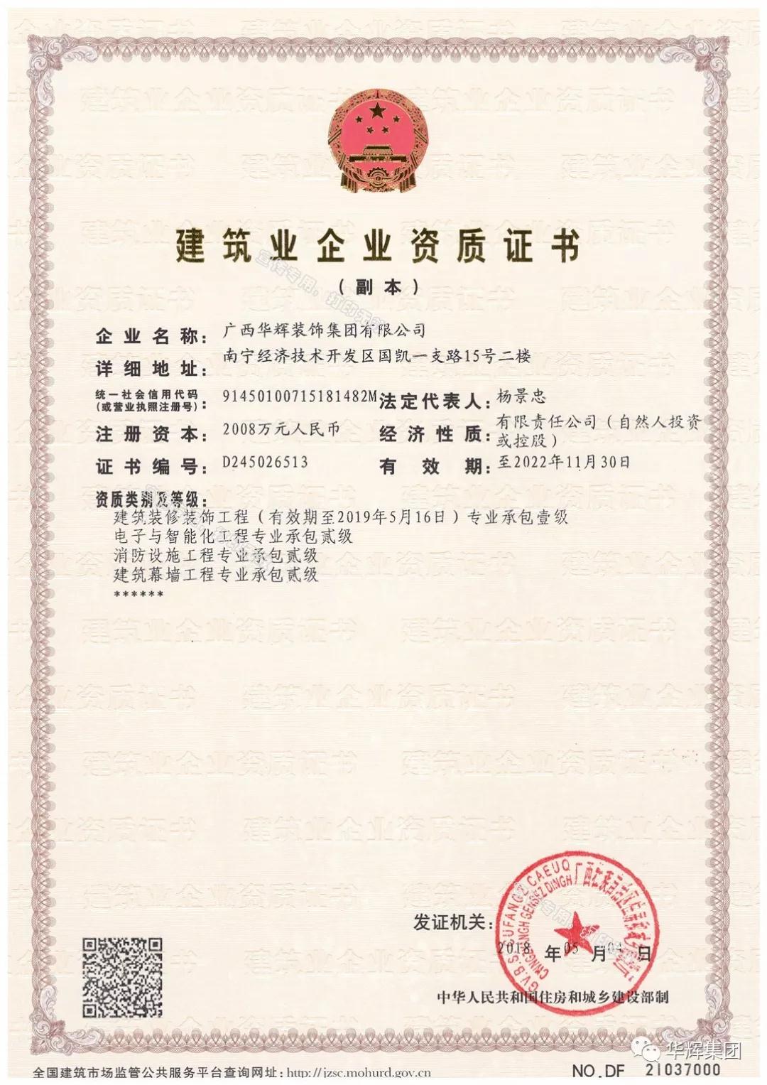▲華輝裝飾集團(tuán)喜獲電子與智能化工程專業(yè)承包貳級(jí)資質(zhì)、建筑工程施工總承包叁級(jí)資質(zhì)、機(jī)電工程施工總承包叁級(jí)資質(zhì)!