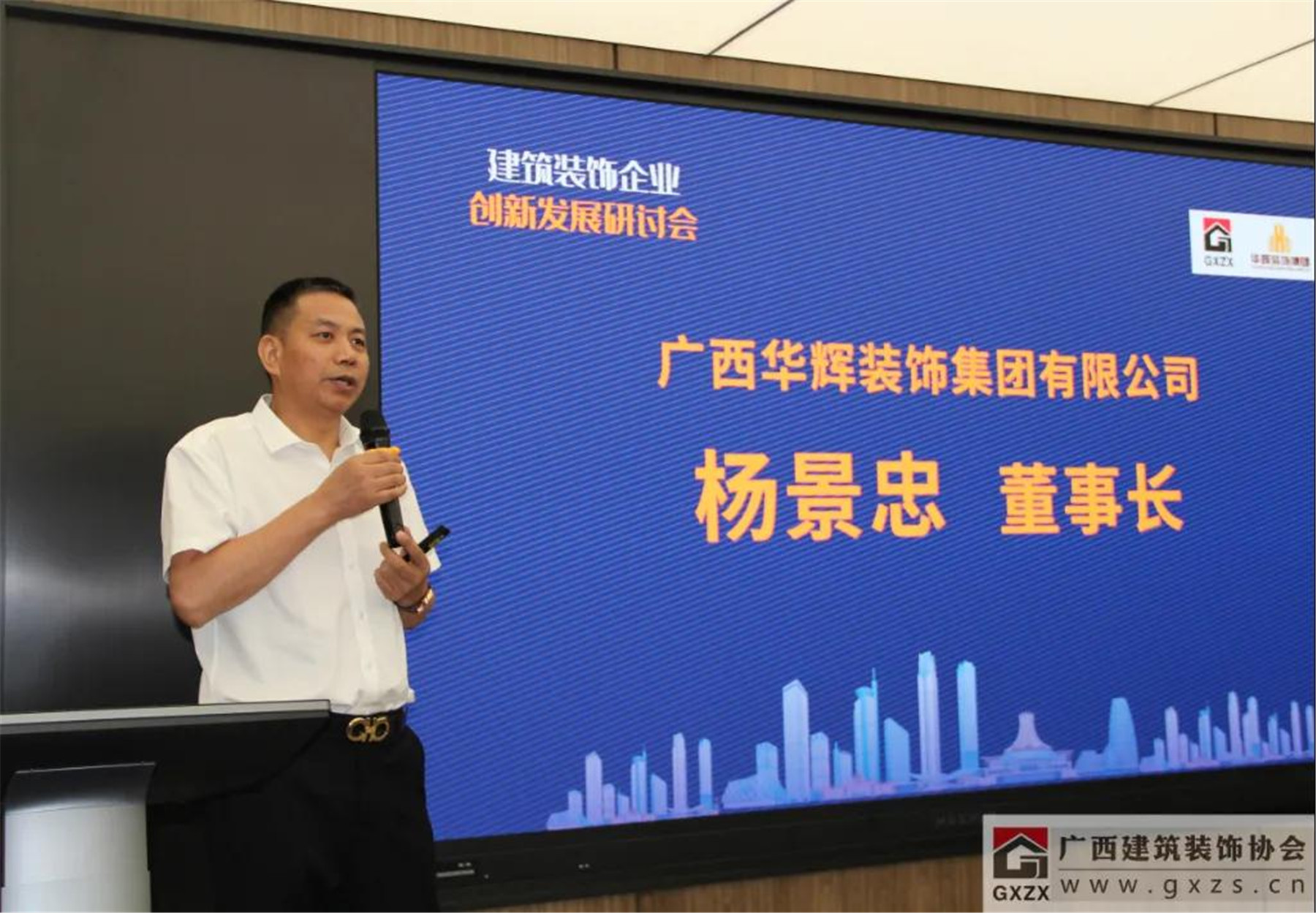協(xié)會(huì)副會(huì)長(zhǎng)、廣西華輝裝飾集團(tuán)有限公司董事長(zhǎng)楊景忠在會(huì)上分享了“三駕馬車驅(qū)動(dòng)華輝轉(zhuǎn)型升級(jí)”的重要作用。
