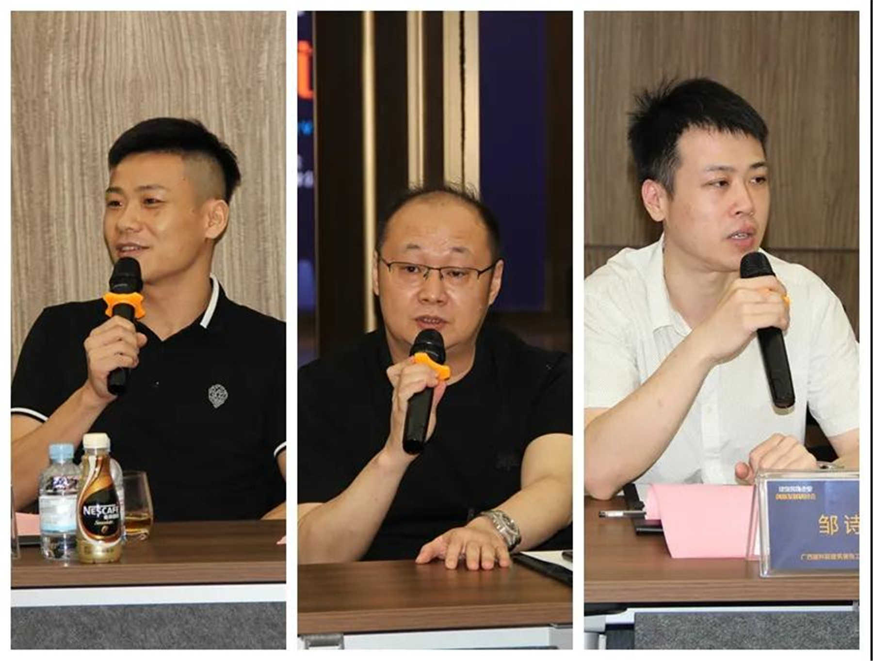 ▲(左)住宅裝修分會(huì)副會(huì)長(zhǎng)、廣西中庭裝飾工程集團(tuán)有限公司董事長(zhǎng) 丁胡,(中)廣西渱鈺川裝飾工程有限公司總經(jīng)理 李靈,(右)廣西建科院建筑裝飾工程有限公司總經(jīng)理 鄒詩(shī)毅