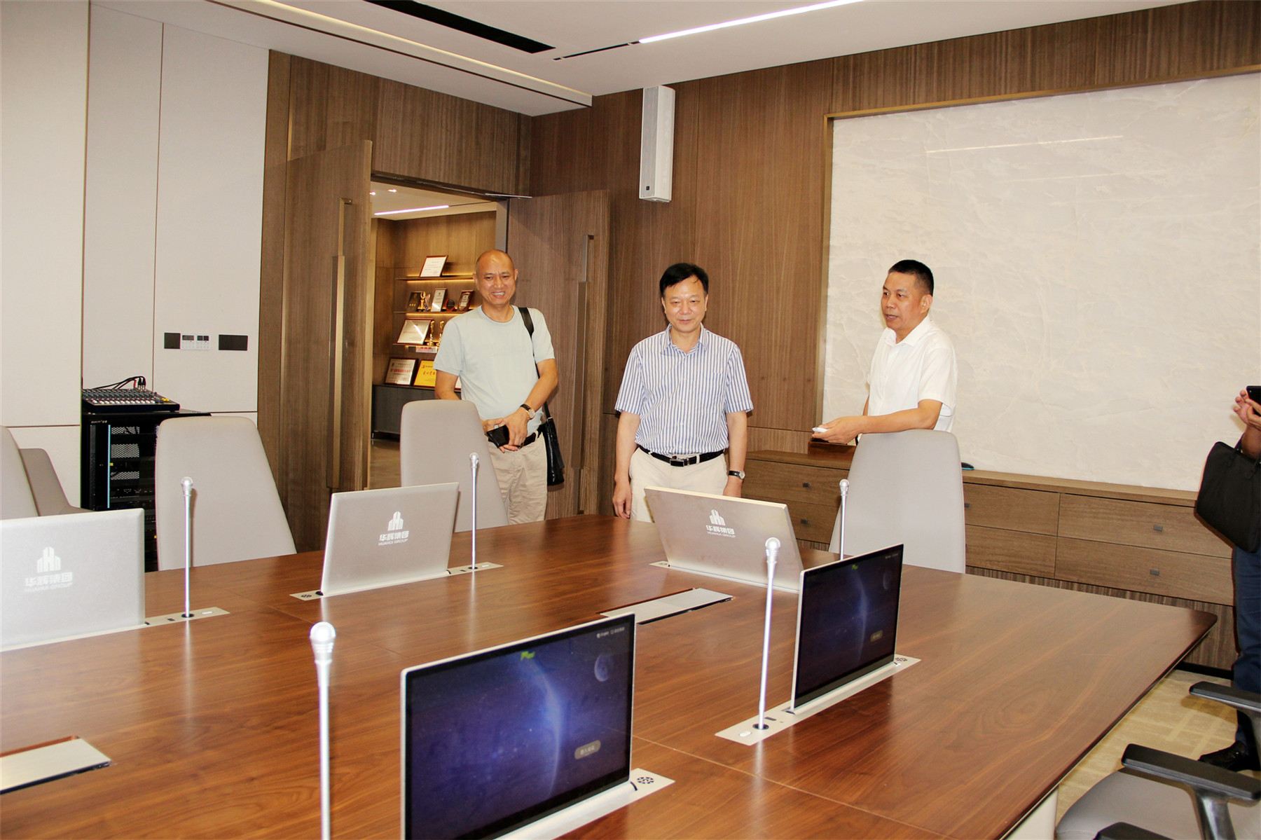 ▲楊景忠董事長(zhǎng)為吳振秋副主席介紹華輝智能化會(huì)議系統(tǒng)開展情況