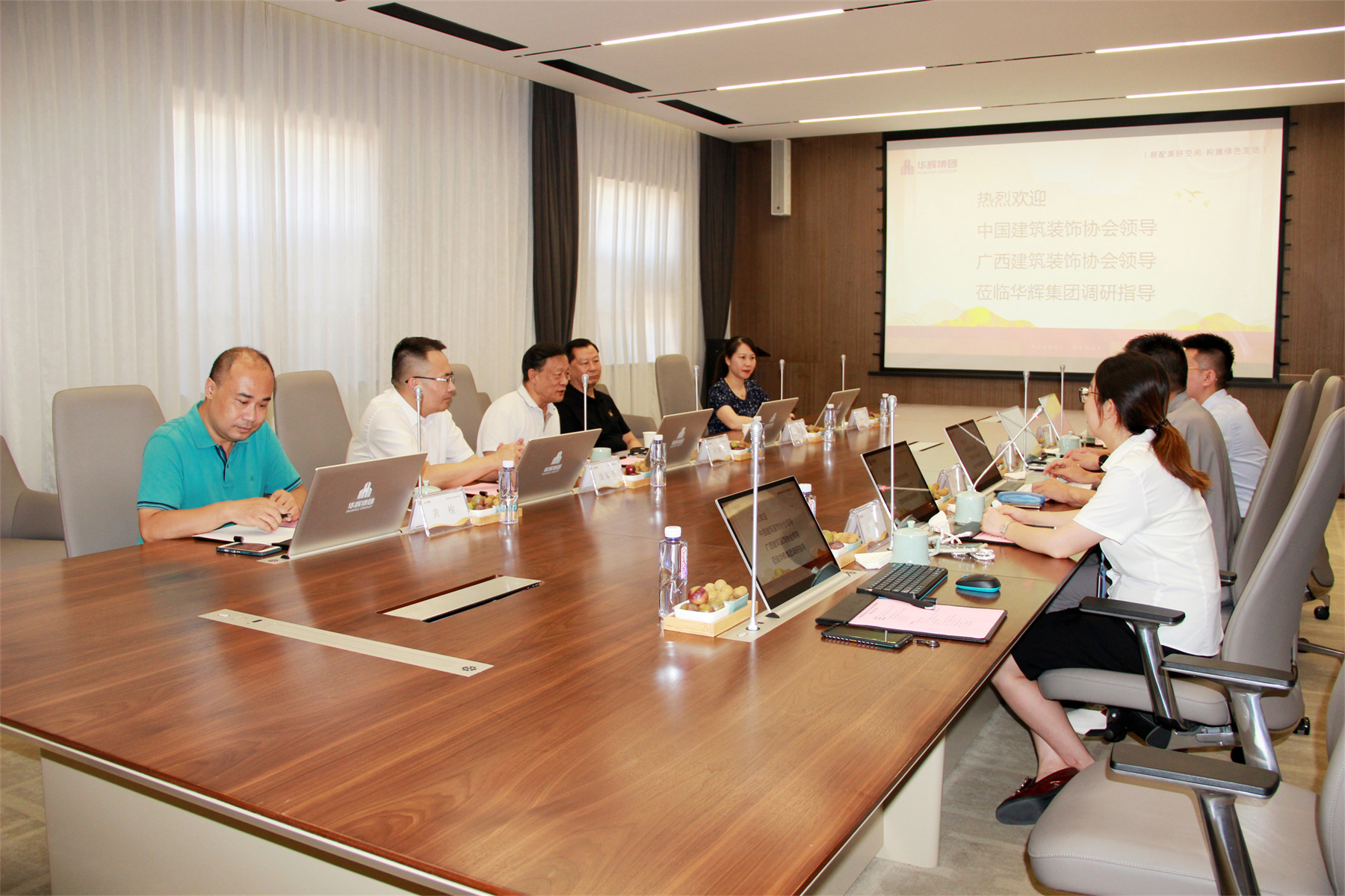 集團(tuán)董事長楊景忠首先對劉曉一會(huì)長、王中奇會(huì)長一行的到來表示歡迎,表示:華輝集團(tuán)的發(fā)展,離不開黨的政策,也離不開中國建筑裝飾協(xié)會(huì)及社會(huì)各界的支持。華輝集團(tuán)將一如既往緊密圍繞“裝配美好空間,構(gòu)建綠色生活”的企業(yè)使命,開拓進(jìn)取,用心打磨每一項(xiàng)精品工程,推動(dòng)企業(yè)高質(zhì)量發(fā)展。集團(tuán)副總裁楊彬就華輝發(fā)展概況、戰(zhàn)略規(guī)劃進(jìn)行專題匯報(bào)。