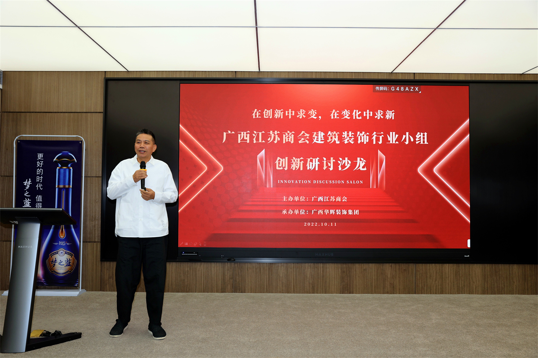 研討會(huì)上,首先由商會(huì)執(zhí)行會(huì)長(zhǎng)、廣西華輝裝飾集團(tuán)董事長(zhǎng)、商會(huì)建筑裝飾行業(yè)小組組長(zhǎng)楊景忠致辭。他說(shuō),在喜迎黨的二十大勝利召開之際,我們相聚在華輝裝飾集團(tuán)舉辦沙龍研討會(huì),作為商會(huì)建筑裝飾行業(yè)小組組長(zhǎng),感謝商會(huì)給予華輝承辦此次沙龍研討會(huì)的機(jī)會(huì)。歡迎大家來(lái)到華輝裝飾集團(tuán)。楊景忠指出,我們要共同努力,緊密結(jié)合廣西江蘇商會(huì)的建筑裝飾企業(yè)的發(fā)展特色,聚焦行業(yè)形勢(shì)、難點(diǎn)問(wèn)題、創(chuàng)新熱點(diǎn),共同探討應(yīng)對(duì)之策,廣開思路、碰撞思想,搭建一個(gè)相互融通、共建互贏的創(chuàng)新平臺(tái),推動(dòng)企業(yè)持續(xù)健康發(fā)展,開創(chuàng)高質(zhì)量發(fā)展新局面,以實(shí)際行動(dòng)迎接黨的二十大勝利召開。