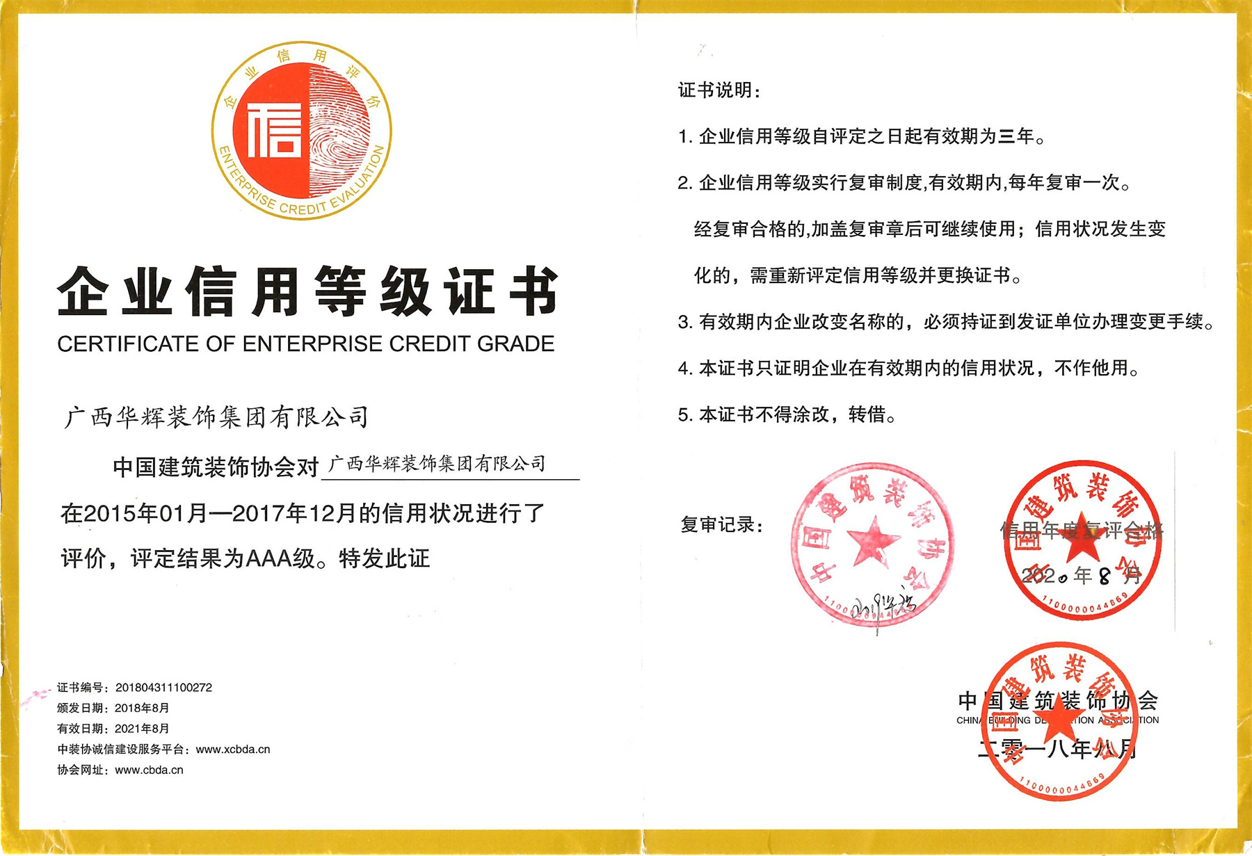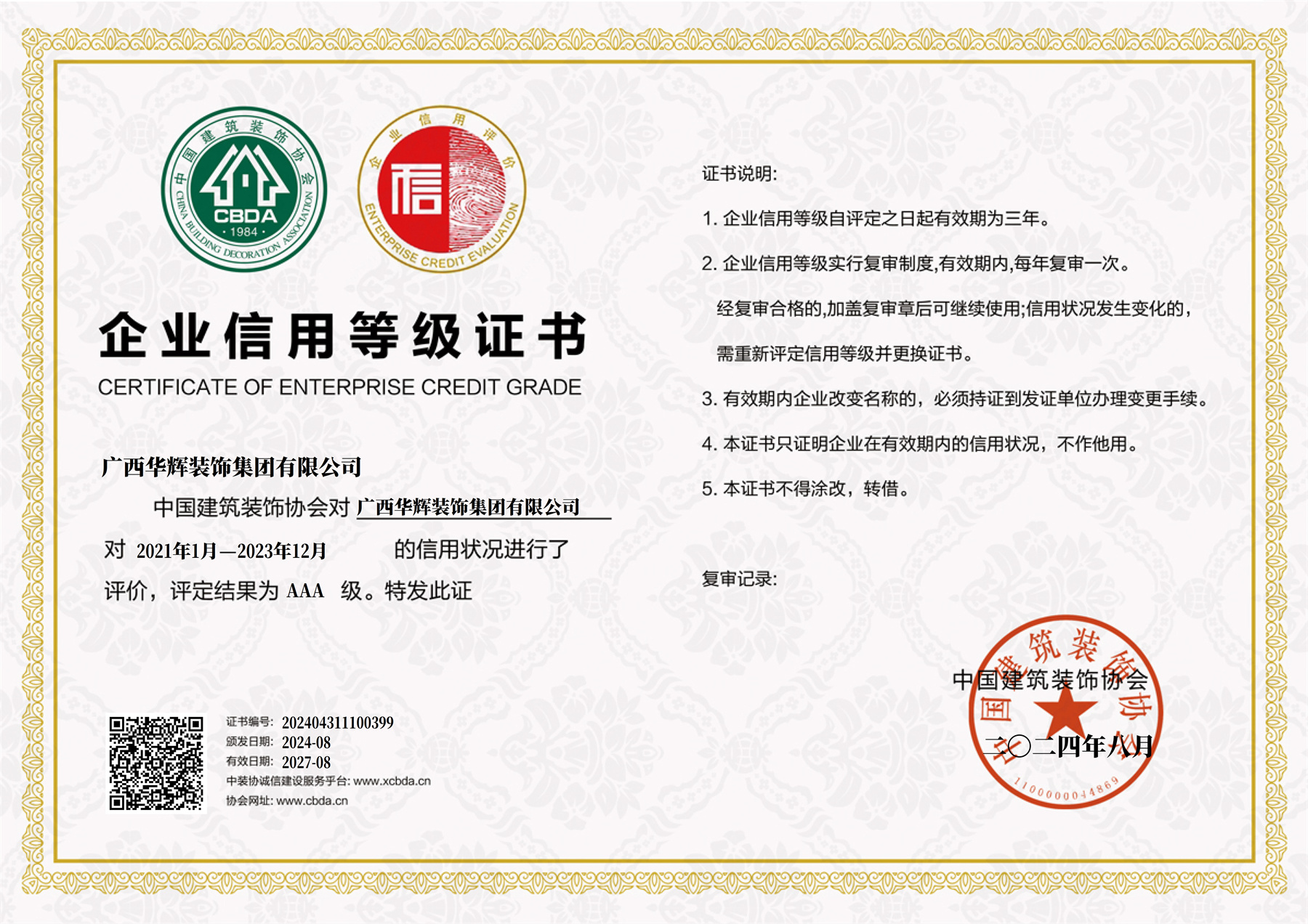 近日,華輝憑借多年來堅持誠信經(jīng)營、良好履約,再度獲評中國建筑裝飾行業(yè)企業(yè)信用AAA級(最高級)評價,這是華輝連續(xù)6年獲評該項信用等級。