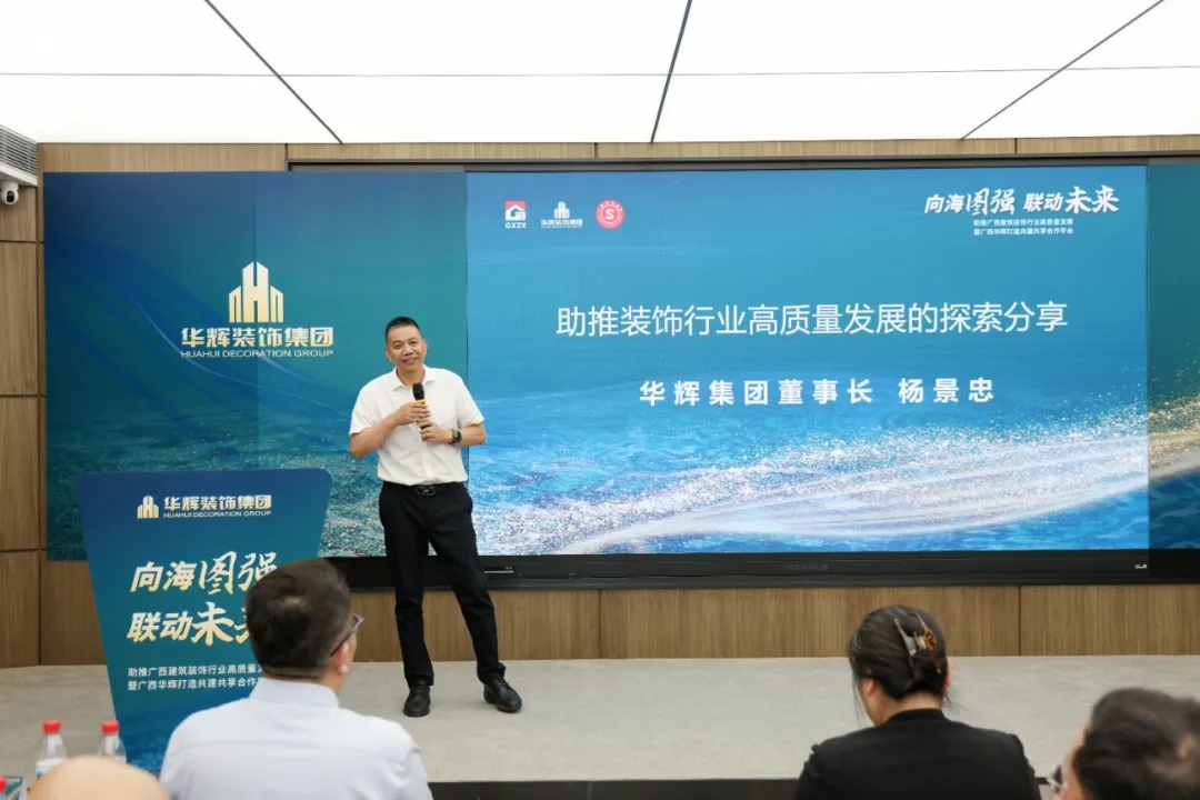 華輝裝飾集團(tuán)董事長楊景忠以深邃的行業(yè)洞察和豐富的實(shí)踐經(jīng)驗(yàn),向與會(huì)嘉賓分享了華輝在助推裝飾行業(yè)高質(zhì)量發(fā)展方面的積極探索。楊景忠指出,裝飾行業(yè)正處在一個(gè)關(guān)鍵的創(chuàng)新升級(jí)期,隨著人們生活水平的提高,人們對(duì)品質(zhì)、美學(xué)的要求越來越高,裝飾行業(yè)也會(huì)不斷有新的需求市場。未來裝企的三條路是向海圖強(qiáng)——出海、搭建平臺(tái)、依托平臺(tái),華輝致力于打造廣西裝飾行業(yè)的“共建共享合作平臺(tái)”,利用華輝25年的優(yōu)勢(shì)和經(jīng)驗(yàn),賦能行業(yè),與行業(yè)企業(yè)攜手共進(jìn),共同應(yīng)對(duì)市場挑戰(zhàn),實(shí)現(xiàn)行業(yè)的可持續(xù)發(fā)展。