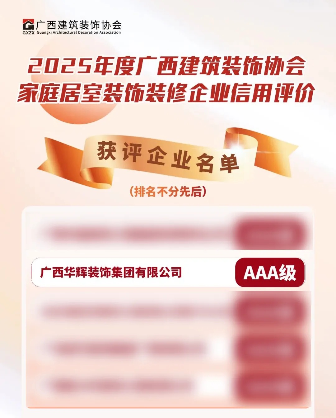 根據(jù)《關(guān)于開展2025年度廣西建筑裝飾協(xié)會(huì)家庭居室裝飾裝修企業(yè)信用評(píng)價(jià)工作的通知》(桂裝協(xié)字〔2025〕第19號(hào))要求,經(jīng)專家組審定和公示,2025年度廣西建筑裝飾協(xié)會(huì)家庭居室裝飾裝修企業(yè)信用評(píng)價(jià)獲評(píng)名單,于2025年9月11日予以公布,廣西華輝裝飾集團(tuán)有限公司為五家AAA級(jí)獲評(píng)企業(yè)之一。