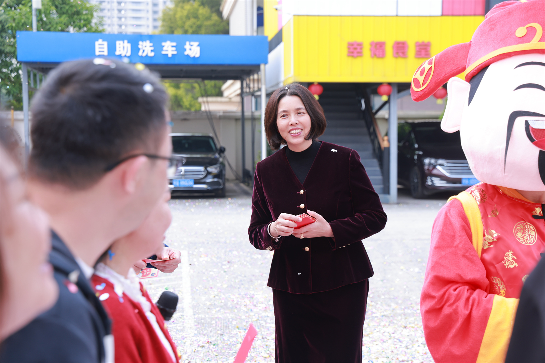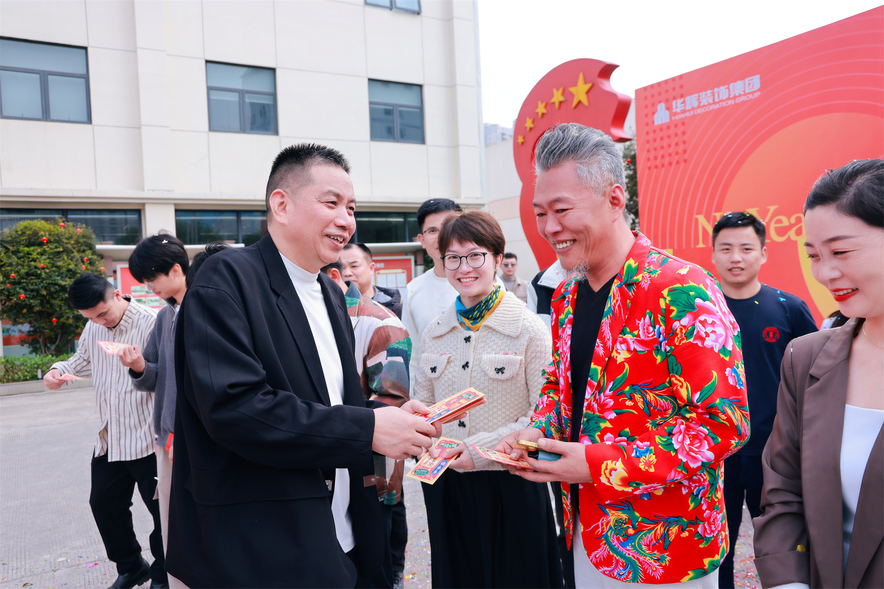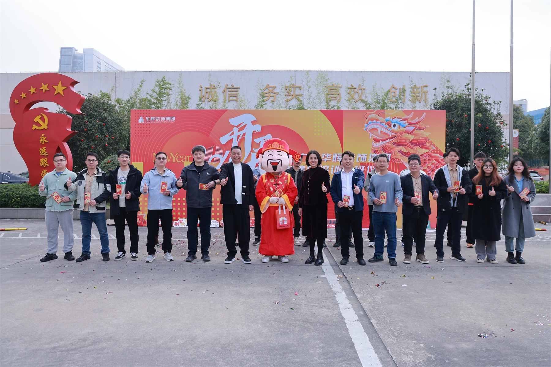 集團(tuán)董事長(zhǎng)楊景忠、董事長(zhǎng)夫人袁婧惠,攜財(cái)神爺一起,為華輝家人們派發(fā)新春紅包,送上開工的第一份祝福與喜悅!